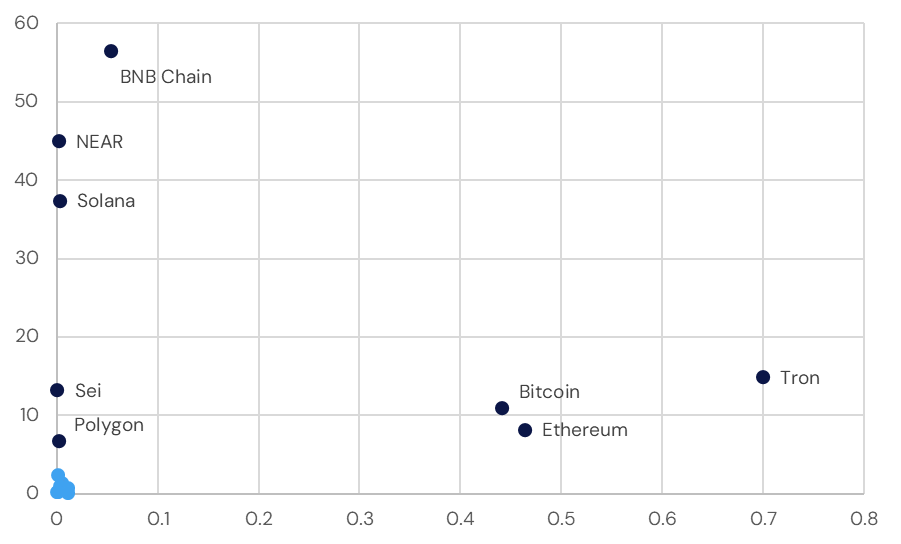 Blockchain MAUs (in millions, y-axis) and Transaction Fee (in USD, x-axis))